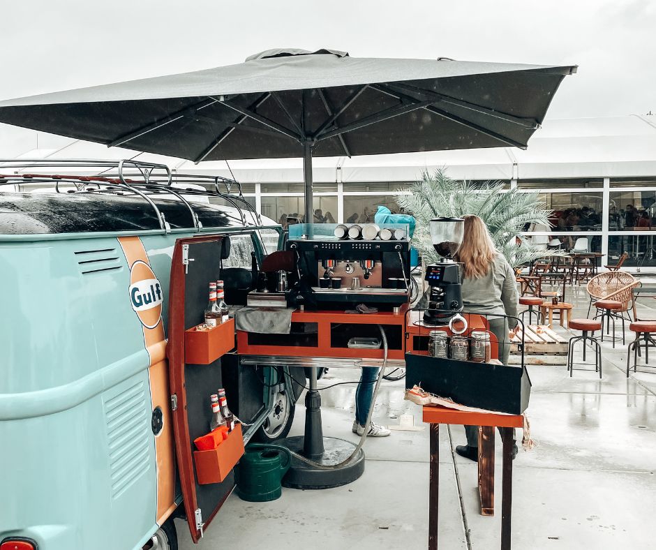 Een volledig gerestaureerde Volkswagen koffietruck die op evenementen ambachtelijke koffiespecialiteiten serveert